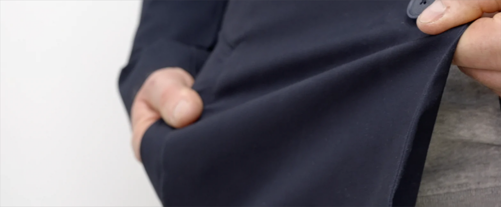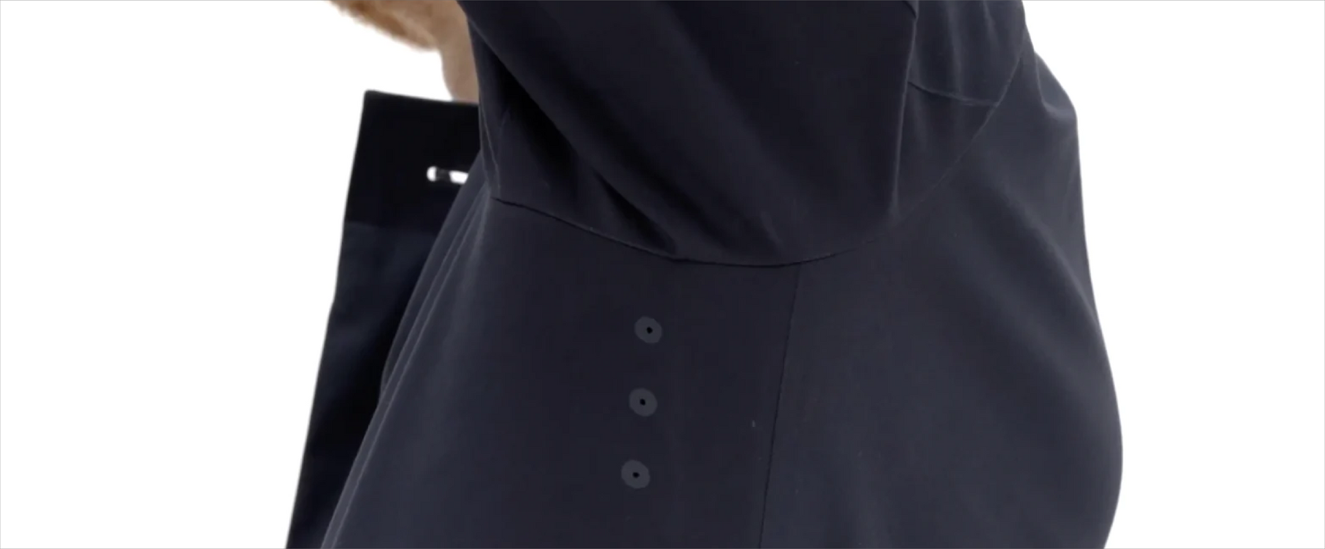 The bonded fabric consists of a cotton outer layer and a traditional raincoat inner layer. The stretch fabric and ventilation holes make it breathable and comfortable. The removable hood can be stored in an extra large side pocket with super soft inner lining.