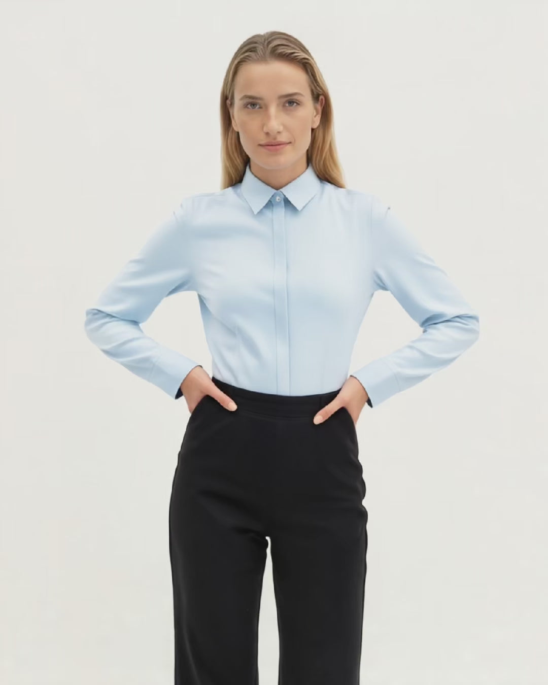 Mød Slim Fit Blusen. Skabt til moderne bevægelse og et skarpt look hele dagen. Den har 4-way stræk i en slim silhuet, der holder formen. Fremstillet af 100% genanvendt polyester med avanceret non-iron og ikke-gennemsigtigt stof, som afviser lugt, pletter og krøller – så du kan droppe både dampjern og lag på lag.